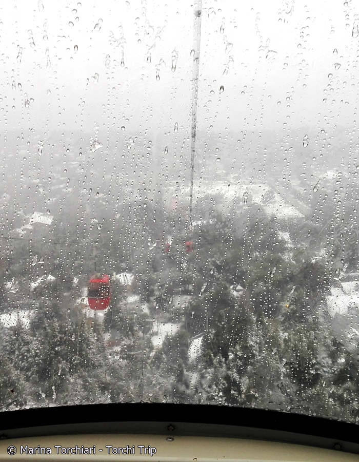 El Cerro Otto es el que más cerca queda de la ciudad de Bariloche, así que es casi siempre la primera parada para ver nieve, sobre todo para los primerizos, estudiantes en viaje de egresados y gente de edad avanzada como yo. Para acceder al complejo, se sube en unos huevitos que se llaman góndolas -awwwww re romántico- por un sistema de cablecarril que recorre los 2100m que separan la base de la cima en unos 12 minutos -bien despacio, apto para fotos-.  El día que fui yo había bastante viento y nieve y todo el show, pero no se hamaca nada.