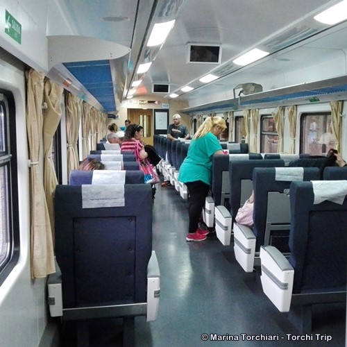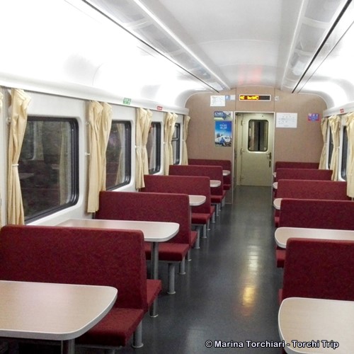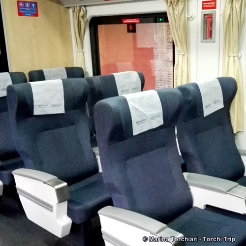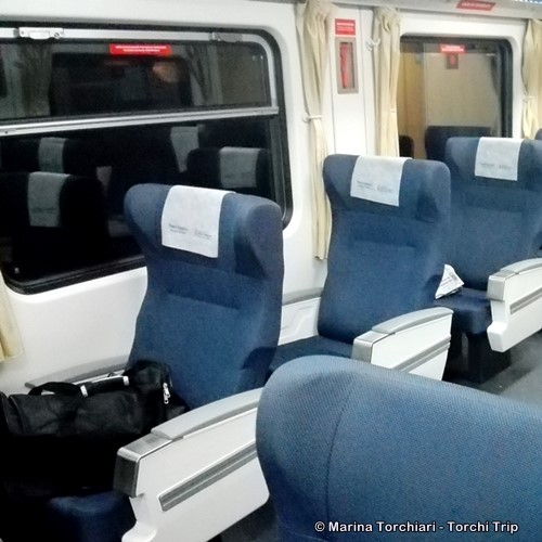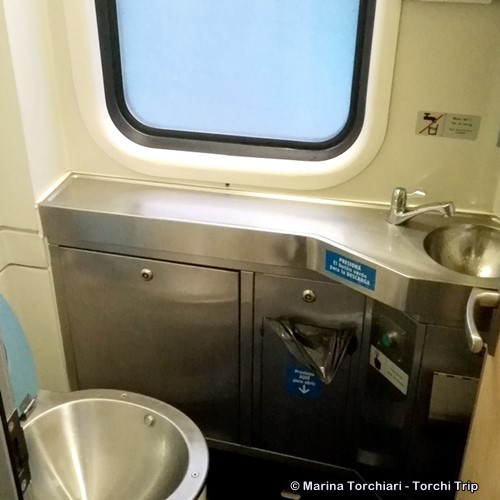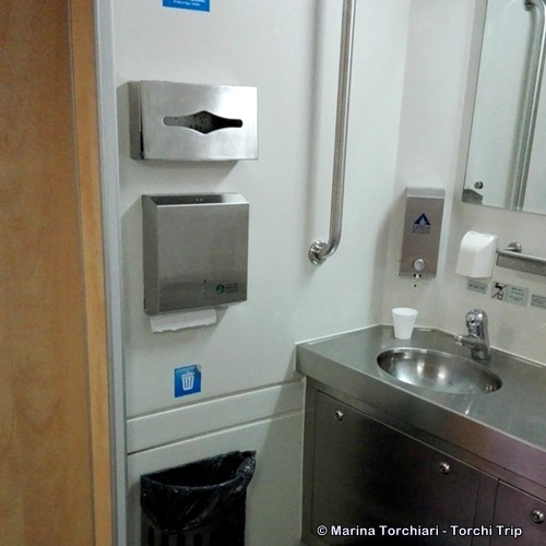 Lo segundo que entraría en la categoría de “bueno” es que los vagones son nuevos y están impecables. Impecables nivel Trenitalia. En Pullman hay dos lavamanos en un extremo y un baño -tipo avión- que se mantiene bastante decente durante todo el viaje (aclaro que fui fuera de temporada, y el vagón estaba al 50% y sin niños). Hay un dispenser de agua caliente y fría -tipo Sparkling- para la Primera y otro para la Pullman (cada categoría tiene 2 vagones). No hay enchufes en los asientos, pero en los extremos -cerca de los lavamanos y portaequipajes- hay enchufes de 220v como para cargar un rato el celular, etc.